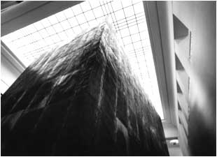 „Der Lichthof im Museum am Ostwall ist das konstruktive Herzstück des Hauses, um das, weit geöffnet, zwei Geschosse gelegt sind. Dieser Lichthof drängt keine Bilder zurück, doch er artikuliert ebenso nobel wie deutlich den eigenen Anspruch der Architektur. Also begegnet Hagebölling ihm, durchaus dialogisch, mit dem Anspruch der Skulptur, die den Raum bricht und braucht. Die Muskelanspannung des knapp neuneinhalb Meter hohen trapezförmigen Blocks verlangt nach Widerstand, sonst geht sie klobig ins Leere und bleibt ein massiges Monument. Gerade weil Hagebölling den Bau genau kennt und seine ästhetischen Stärken analysiert, kann seine Plastik so präzis wirksam sein. Sie bricht, bei aller raumhohen, raumweiten Expansion, nicht einfach als wuchtige okkupatorische Geste ein. Sie besetzt den Hof, aber mit strategischem Kalkül. Sie basiert auf dem abgewogenen System rechter Winkel, das sich vom Grundriss über den Aufriss bis zur Doppelreihe der Durchblicke und zum Netz der Dachstreben zieht.